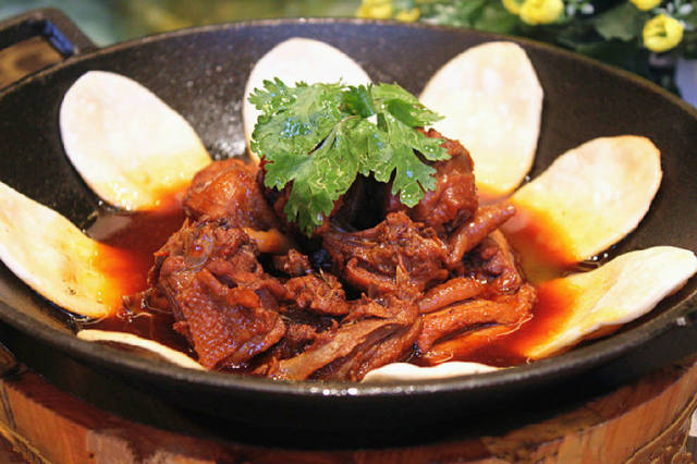 三、制作过程 另锅放油烧热,爆香姜片、蒜仔、八角、花椒,倒入鸡块,烹入料酒,煸炒至水分将干时,添入高汤,加盖焖至汤汁浓稠、鸡块熟时,下入青红椒,调入精盐、味精、鸡精、鲜辣味粉、美极鲜酱油,稍后再下少许老抽调色并起锅盛入面饼锅中,随配酒精炉(或小土炉)上桌即成。